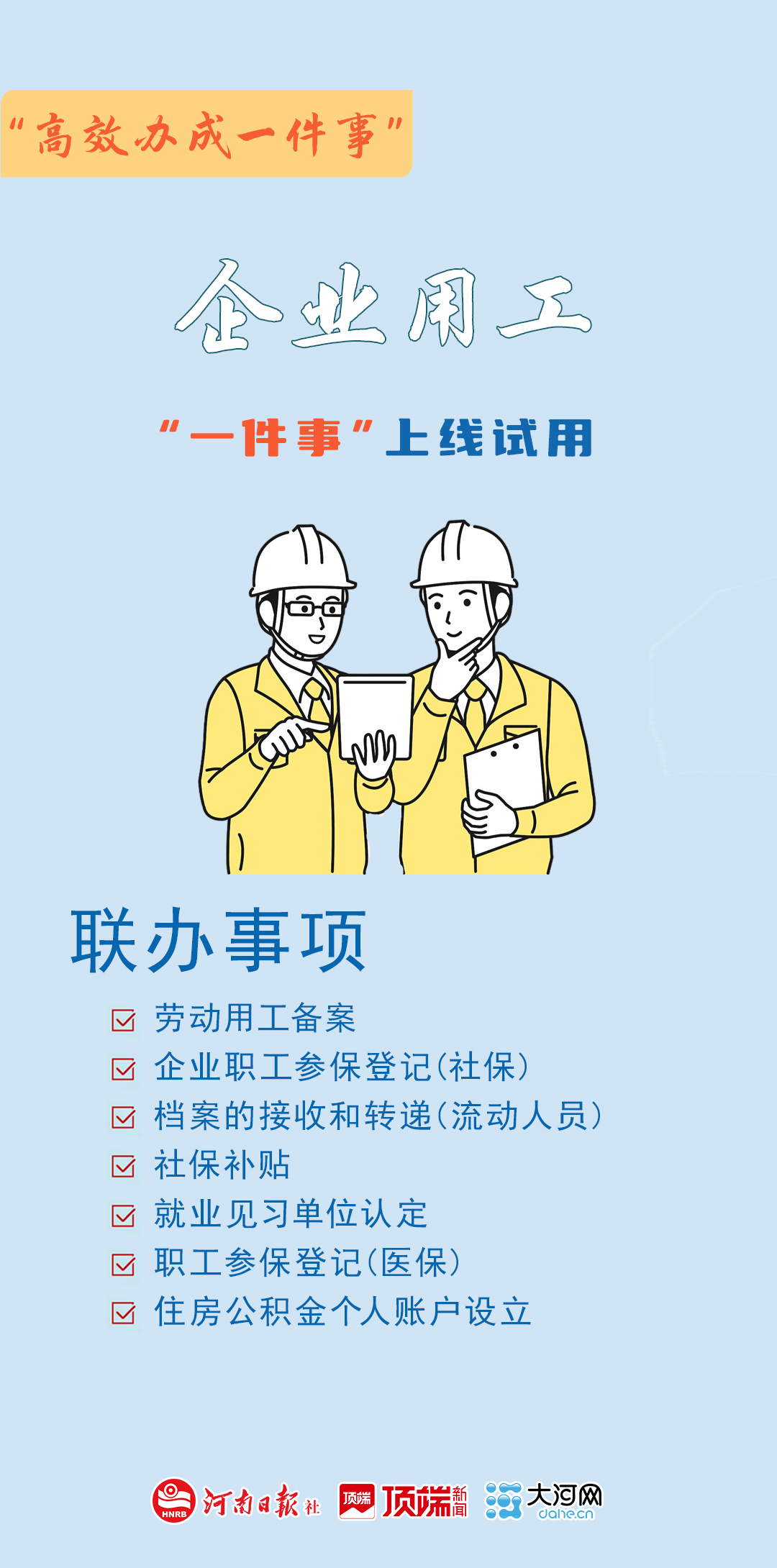 为切实解决企业群众“多头跑、材料繁”的痛点,持续优化营商环境,近日,人社、住建、医保等部门通过整合跨部门业务,推出河南省企业用工“一件事”。企业用工“一件事”实现劳动用工备案、企业职工参保登记(社保)、档案的接收和转递(流动人员)、社保补贴、就业见习单位认定、职工参保登记(医保)、住房公积金个人账户设立等7个事项集成办理,从“多头跑、多次办”变为“一次告知、一表申请、一套材料”,企业办事效率大幅提升。