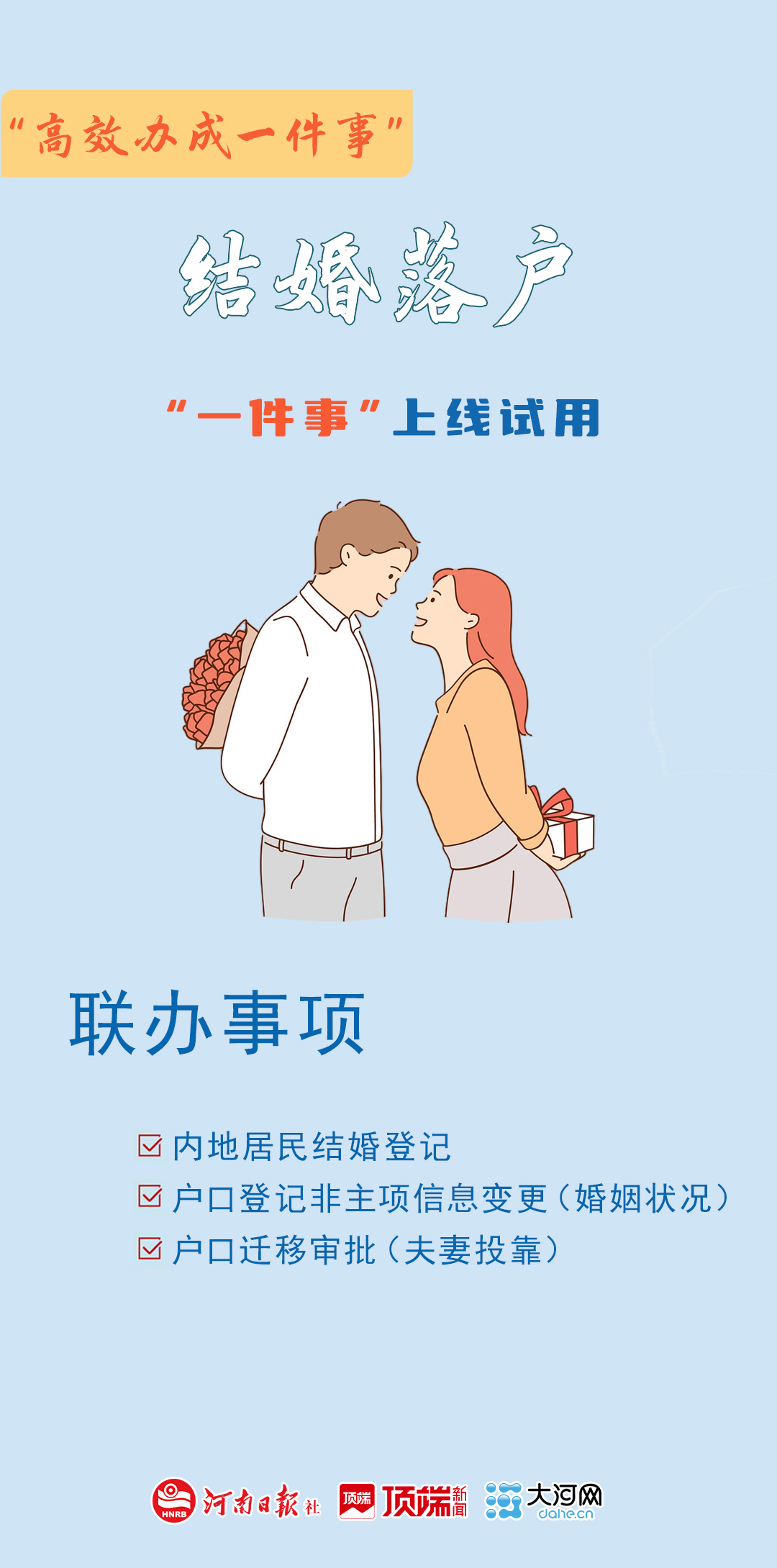 记者从省民政厅了解到,河南省结婚落户“一件事”服务在全省各县(市、区)婚姻登记机关落地实施。河南省户籍的男女双方在婚姻登记窗口,只需填报一张表、提交一套材料,即可一次办理居民结婚登记、户口登记非主项信息变更(婚姻状况)、户口迁移审批(夫妻投靠)3个事项。
